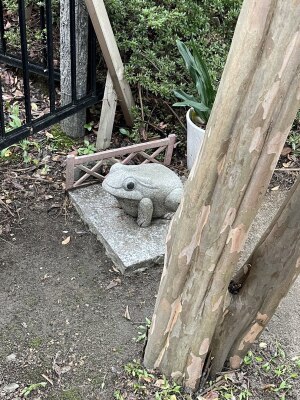 三社神社のアイドルといえば、境内のあちこちにいる「カエル」の石像。