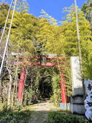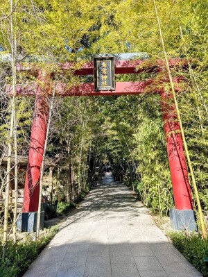 一歩足を踏み入れ、鮮やかな朱色の鳥居をくぐると、そこには美しい竹林の参道が続いています。