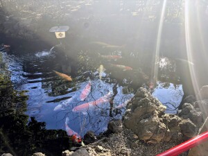 赤い橋を渡ってお参りしていると、池の鯉たちが「エサかな?」と寄ってくる姿に癒やされます(笑)。