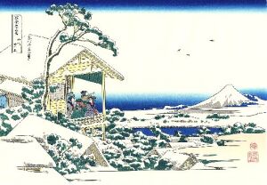 江戸時代には有名な浮世絵師・葛飾北斎の「富嶽三十六景」で、唯一の雪景色を描いた名作(1831~1833年頃)「礫川 雪ノ旦(こいしかわ ゆきのあした)」を描いた地が、この神社の境内にあった茶屋ではないか、と考えられています。