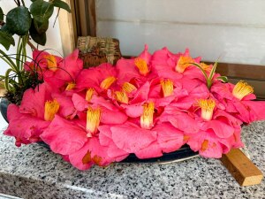 社務所の窓口に飾られた美しい生け花は、この神社の「おもてなしの心」を表しているかのよう。